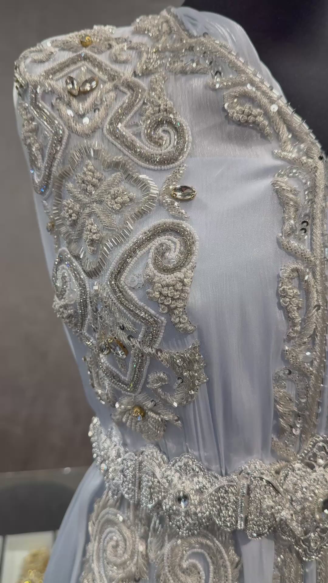 Het betreft een soepel vallende organza stof in de kleur parelblauw, bewerkt met zilveren bewerking, kralen en steentjes.